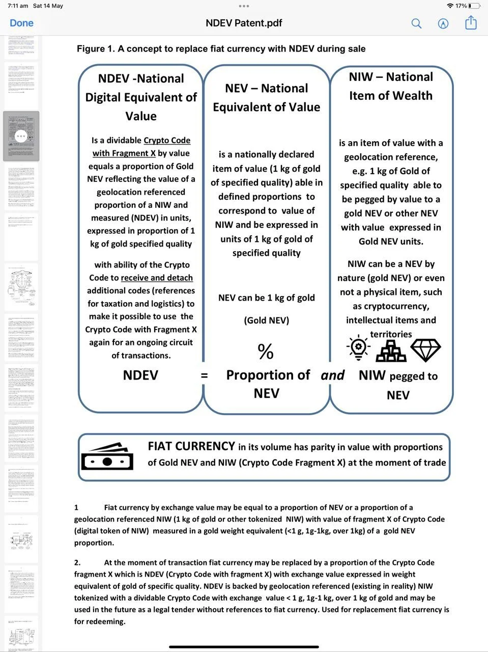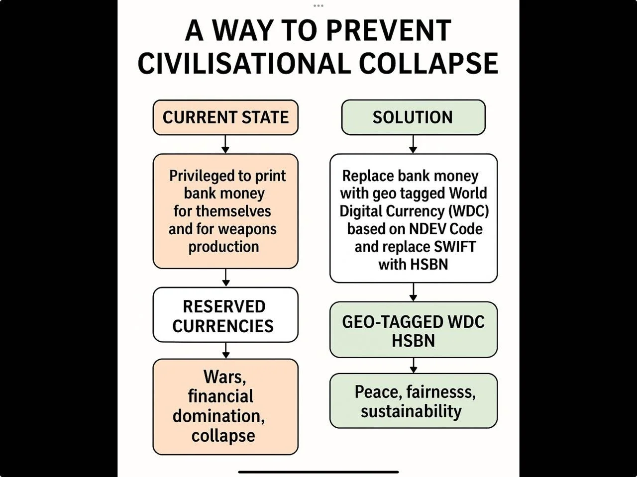 To replace fiat bank money with a geo-tagged World Digital Currency (WDC) based on the NDEV Code, and to replace SWIFT with HSBN – a blockchain-based infrastructure that directly ties money to real territorial values and resources from where the NDEV Code appeared in the net.