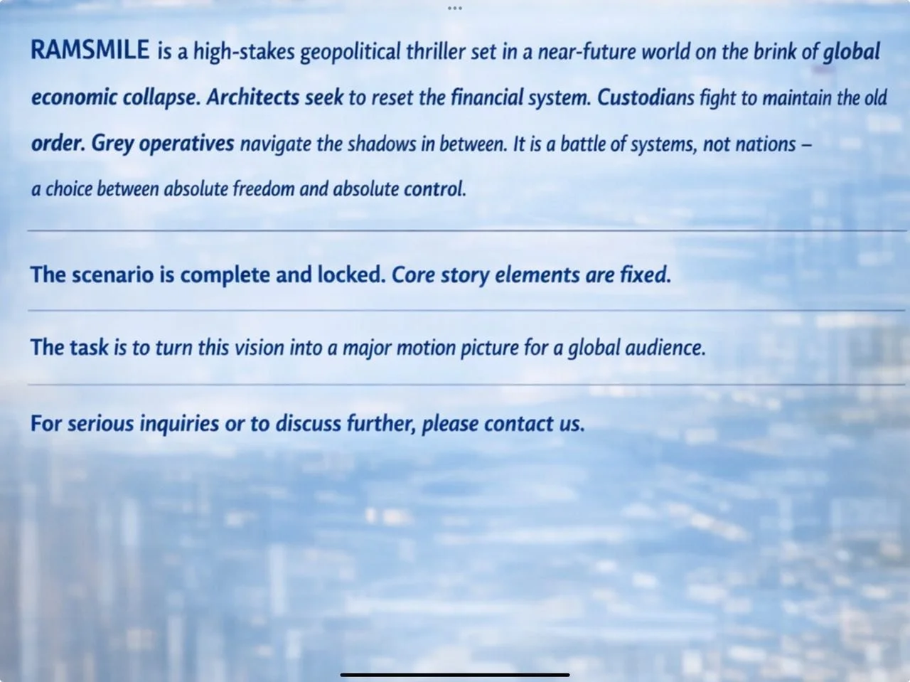 RAMSMILE is a smart, contained, globally relevant film that replaces financial apocalypse with systemic resolution—and does so in a way that is cinematic, fundable, and timely.