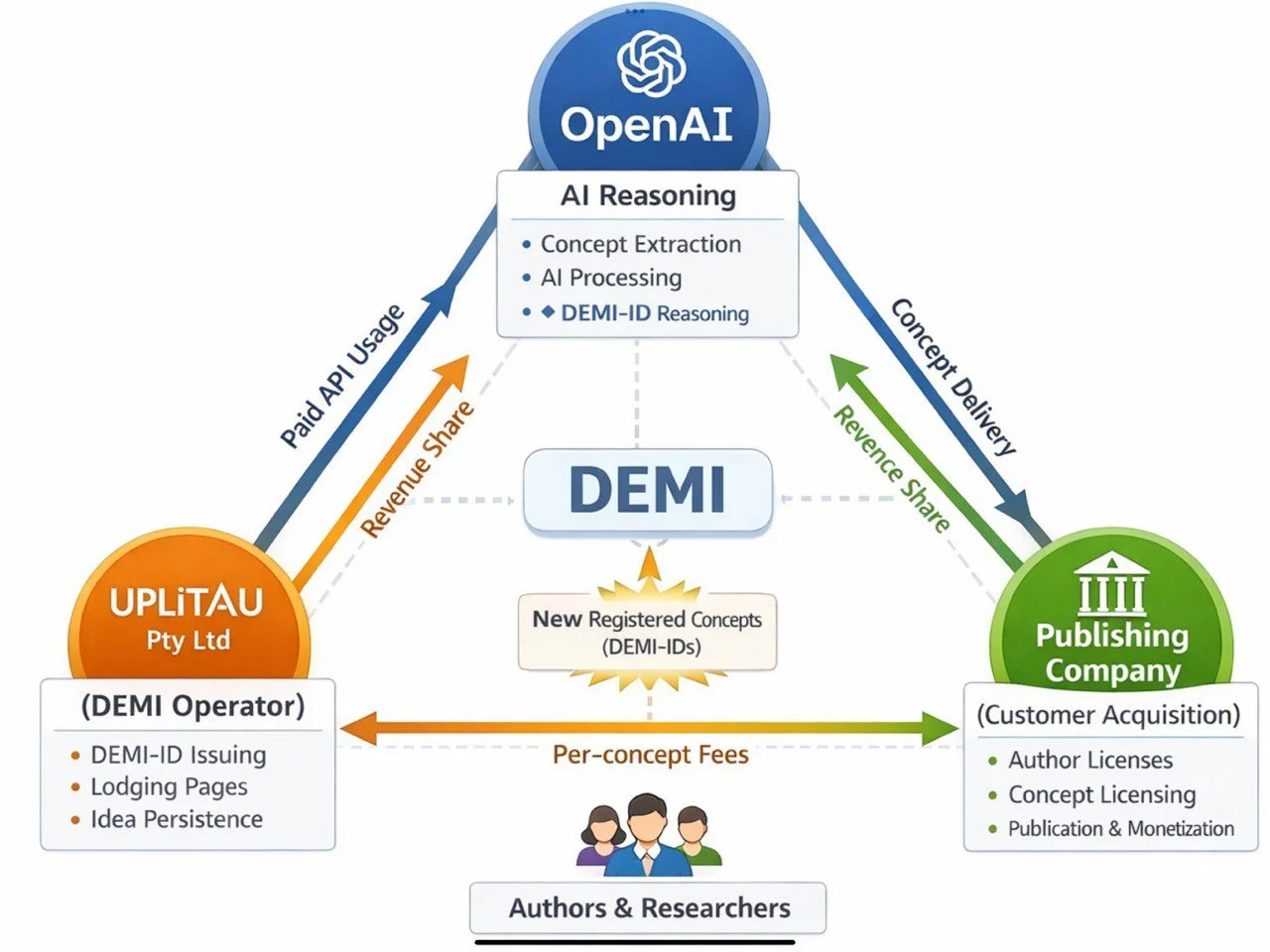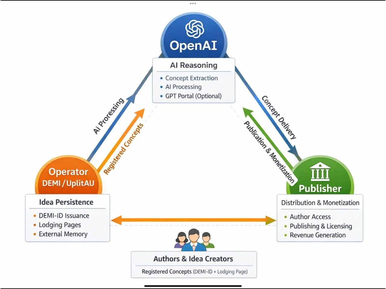 DEMI v2 turns an AI-extracted idea into a cryptographically time-anchored conceptual artifact—without forcing OpenAI, publishers, or authors into custodial risk.