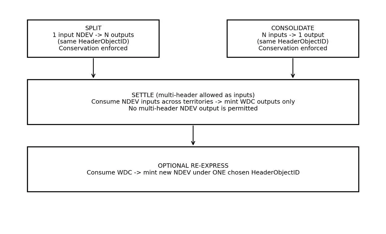 The staged process is further illustrated through a set of colour communication diagrams describing token creation, value structure, settlement flows, and audit lineage.